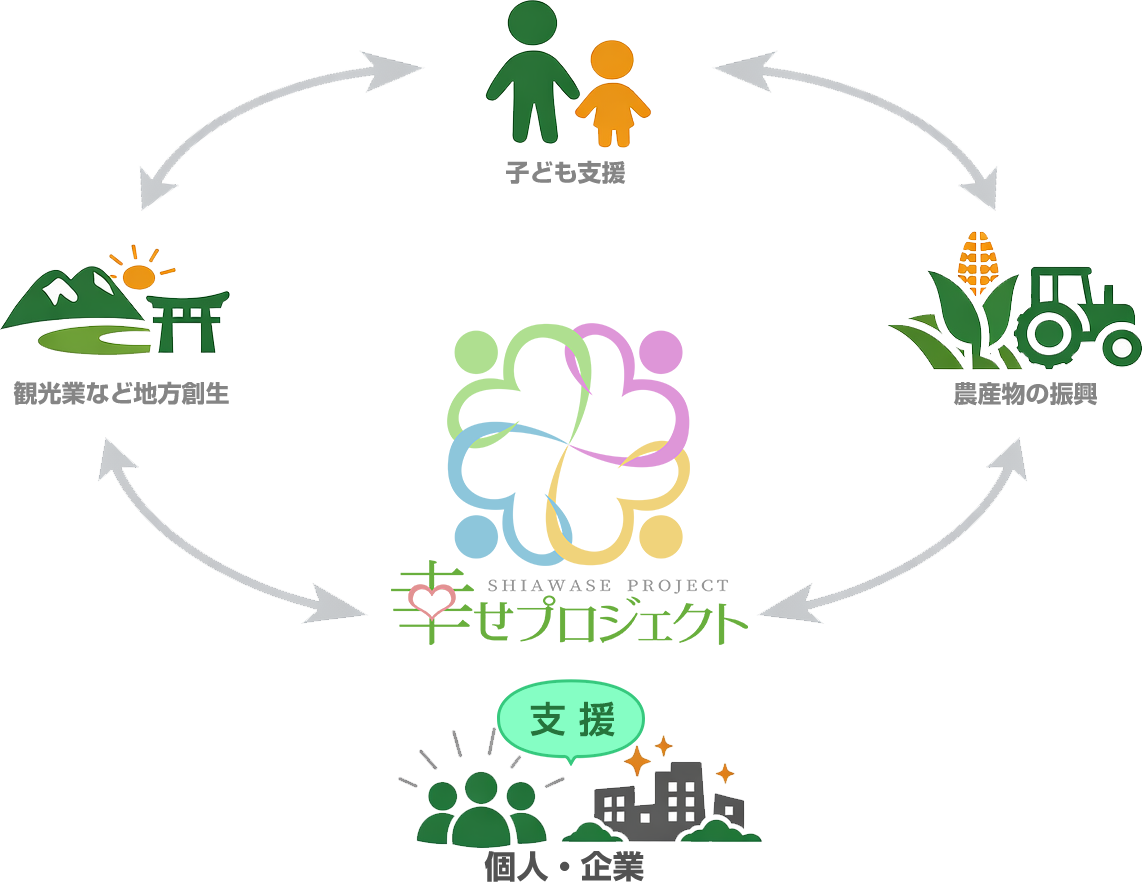 被災地の復興協力幸せプロジェクトでは、「未来ある子どものための活動」「地方の過疎対策」「農産物等の地域の特産品の振興」は全て一本の線でつながっていると考えております。